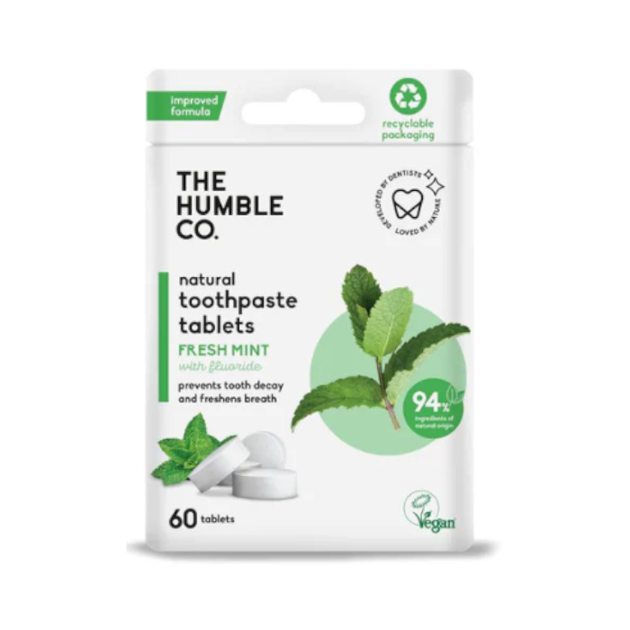 SOBRE: Dentífrico natural em pastilhas com flúor (1450 ppm) e um aroma fresco a menta é uma alternativa conveniente e sustentável para a sua higiene diária.