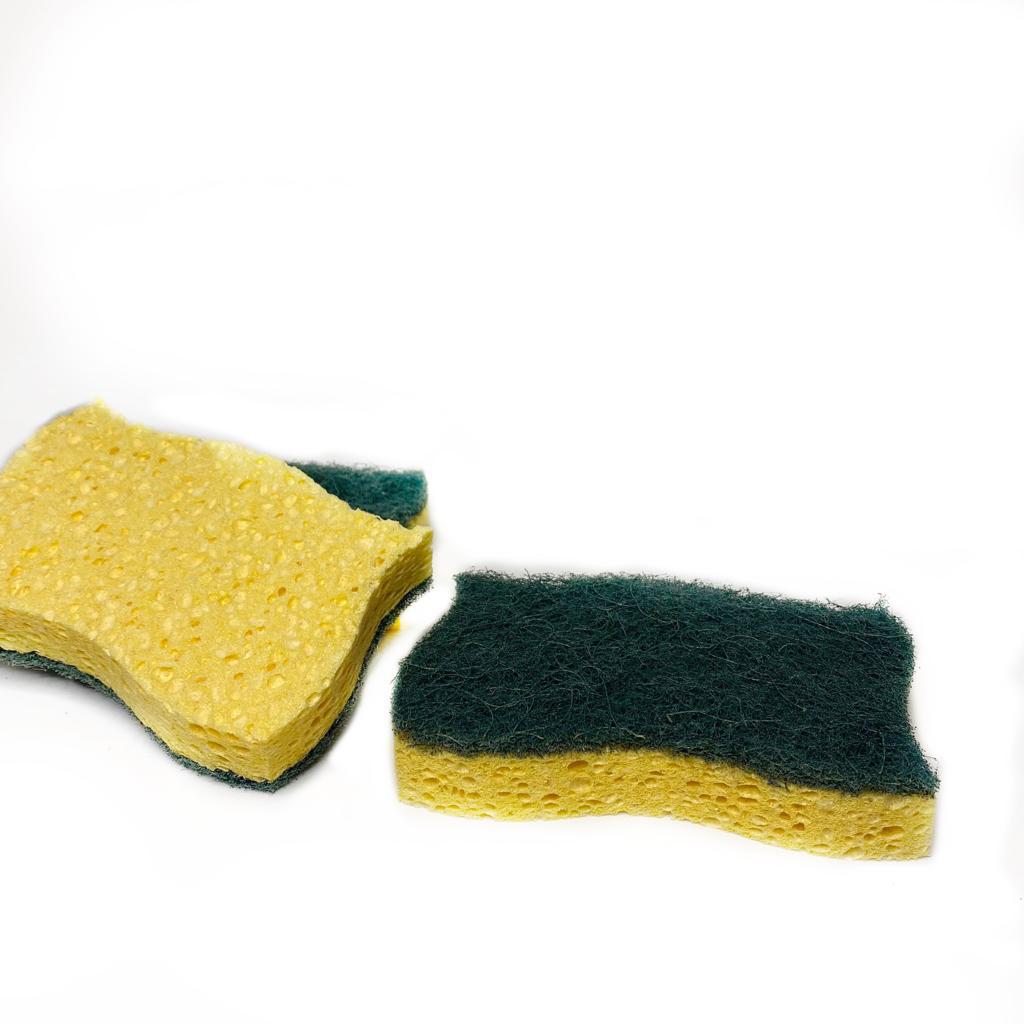Compostas por uma esponja vegetal biodegradável com um lado de esfregão feito com abrasivos minerais e fibras naturais e recicladas.